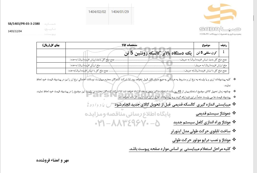 استعلام بها و موضوع استعلام استعلام کرن سقفی 5 تن به اطلاع کلیه شرکتها و افراد متخصص واجد شرایط میرساند، آگهی گذار در نظر دارد از طریق استعلام بها، نسبت به انتخاب و دریافت پیشنهادات اقدام نماید. این استعلام با کد آگهی ثبت شده در سامانه خبرگزاری پارس نماد : 8895944 منتشر شده است. مشخصات استعلام : تاریخ شروع استعلام: 1404/01/30 آخرین مهلت ارسال پیشنهاد قیمت : 1404/02/02 و محل اجرای پروژه : استان سایر میباشد. استعلام قیمت مورد درخواست : استعلام کرن سقفی 5 تن با دستهبندیهای تخصصی و گروه های مرتبط : بالابر صنعتی, نیروگاه, جرثقیل, تجهیزات برق و الکترونیک, استعلام اطلاع رسانی میگردد.