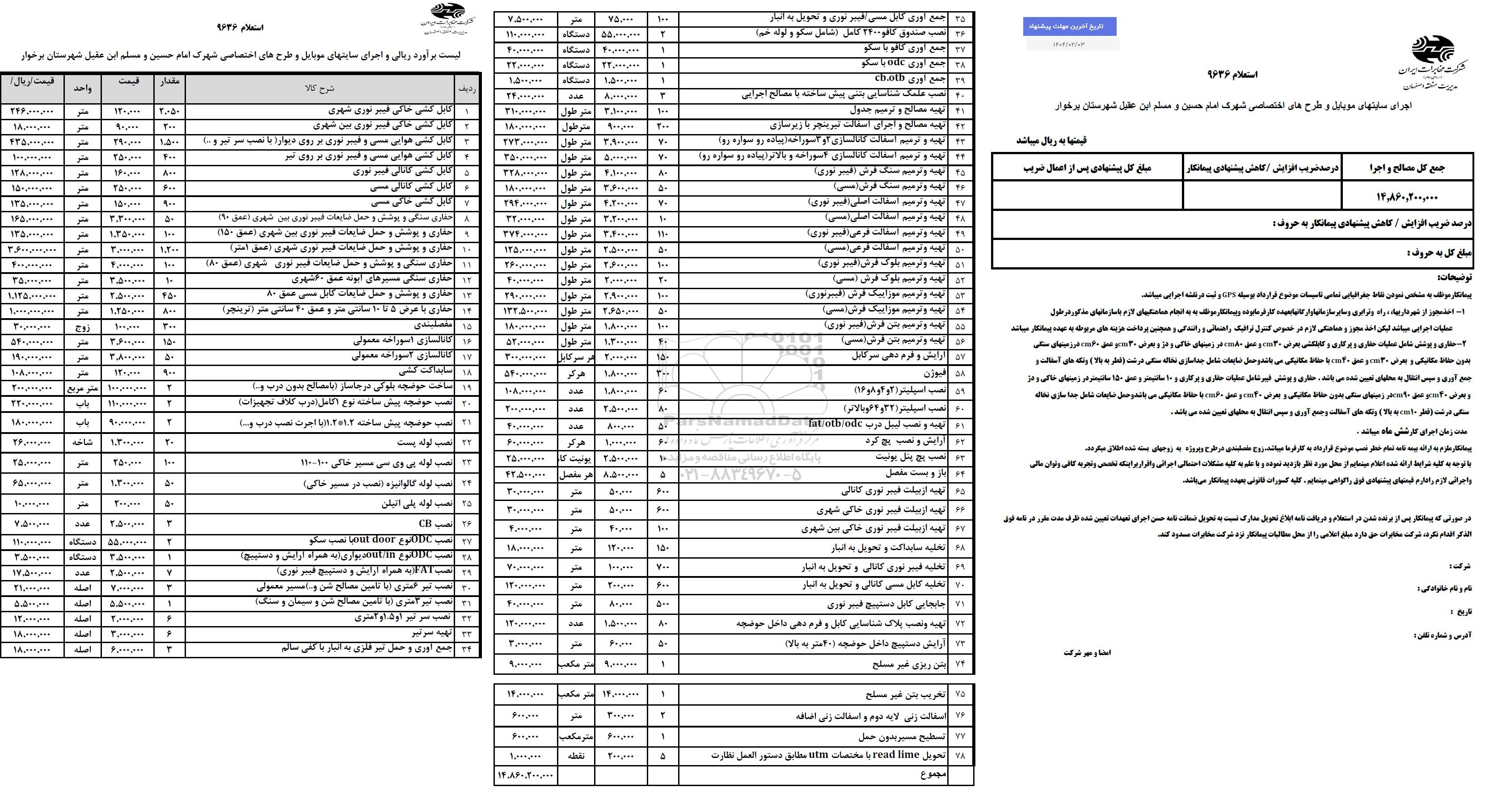 استعلام بها و موضوع استعلام اجرای سایتهای موبایل و طرح های اختصاصی شهرک امام حسین و مسلم ابن عقیل به اطلاع کلیه شرکتها و افراد متخصص واجد شرایط میرساند، آگهی گذار در نظر دارد از طریق استعلام بها، نسبت به انتخاب و دریافت پیشنهادات اقدام نماید. این استعلام با کد آگهی ثبت شده در سامانه خبرگزاری پارس نماد : 8895972 منتشر شده است. مشخصات استعلام : تاریخ شروع استعلام: 1404/01/30 آخرین مهلت ارسال پیشنهاد قیمت : 1404/02/03 و محل اجرای پروژه : استان اصفهان میباشد. استعلام قیمت مورد درخواست : اجرای سایتهای موبایل و طرح های اختصاصی شهرک امام حسین و مسلم ابن عقیل با دستهبندیهای تخصصی و گروه های مرتبط : پیمانکاری مخابرات, حفاری و حفر چاه آب, استعلام اطلاع رسانی میگردد.