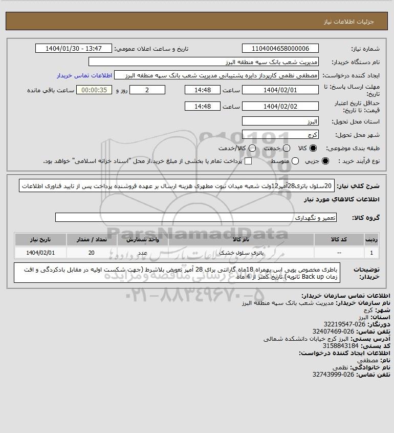 1 -- باتری سلول خشک عدد 20 1404/02/01