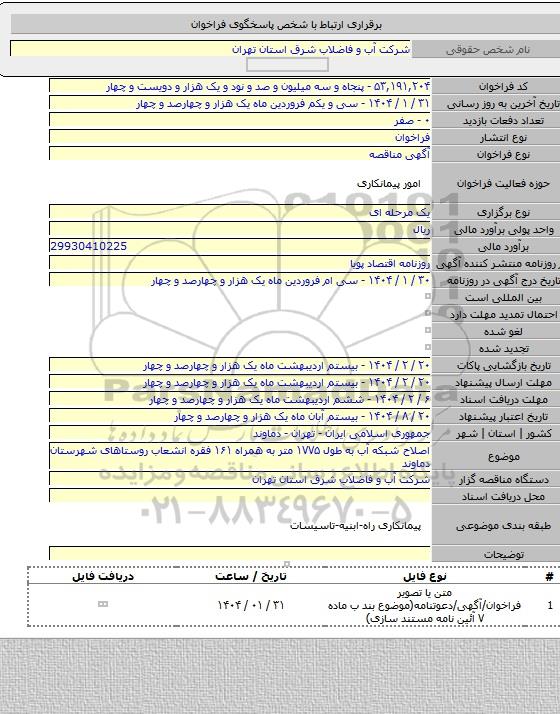 مناقصه اصلاح شبکه آب به طول ۱۷۷۵ متر به همراه ۱۶۱ فقره انشعاب روستاهای شهرستان دماوند از کلیه افراد متخصص و شرکت‌ها واجد شرایط دعوت به عمل می‌آید در مناقصه با کد خبرگزاری پارس نماد: 8896053 شرکت نمایند. این مناقصه در تاریخ 1404/01/30 شروع و مهلت آن تا تاریخ 1404/02/06 میباشد.