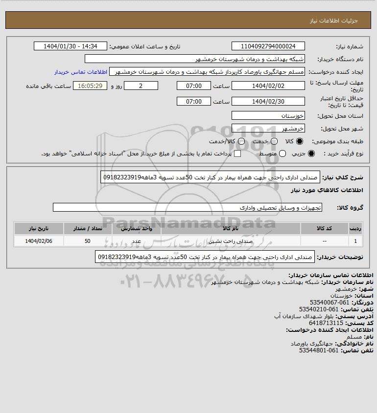 شرح کلی نیاز: صندلی اداری راحتی جهت همراه بیمار در کنار تخت 50عدد تسویه 3ماهه09182323919