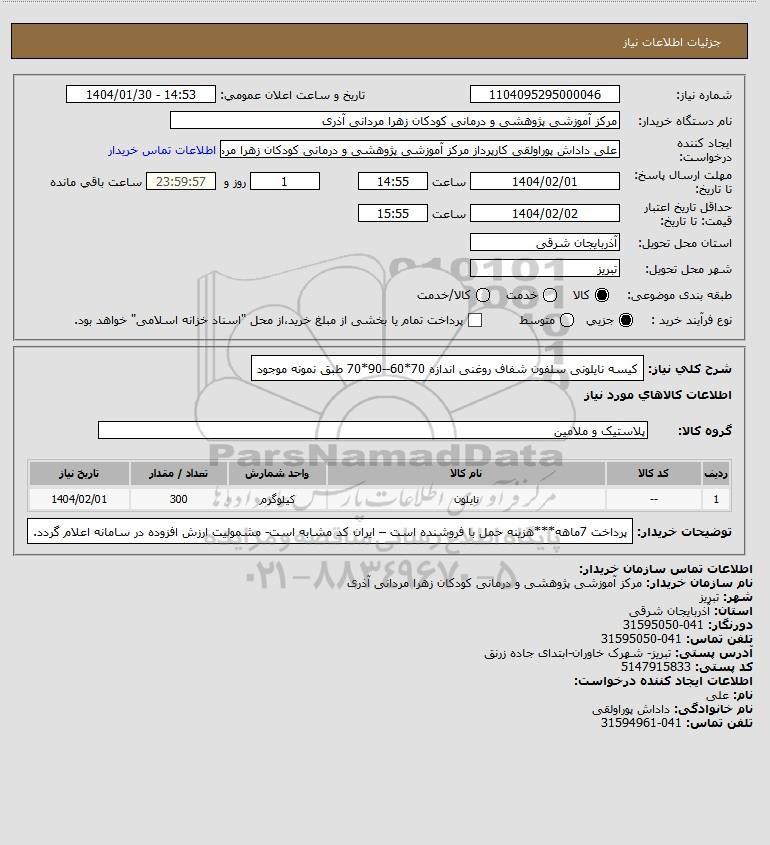 | 1 | -- | نایلون | کیلوگرم | 300 | 1404/02/01 |