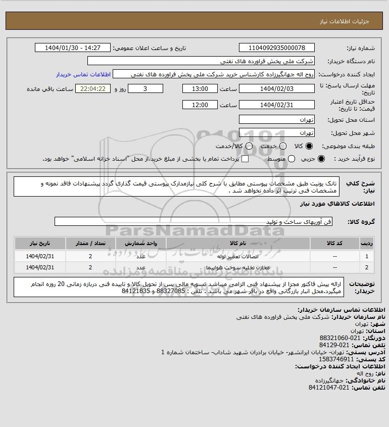 شرح کلی نیاز: تانک یونیت طبق مشخصات پیوستی