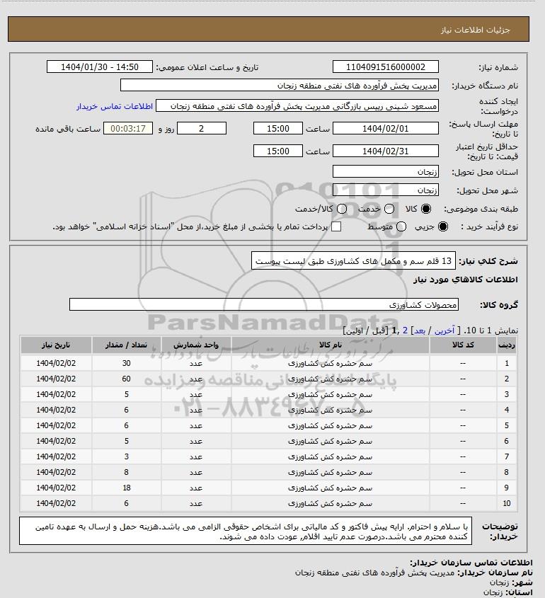 | 10 | -- | سم حشره کش کشاورزی | عدد | 6 | 1404/02/02 |