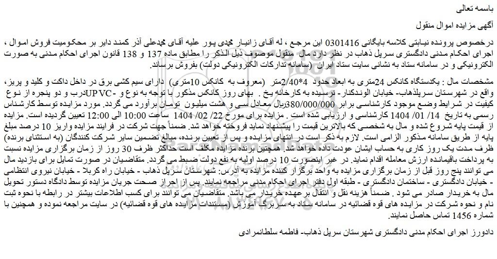 درخصوص پرونده نیابتی کلاسه بایگانی 0301416 این مرجع ، له آقای زانیار محمدی پور علیه آقای محمدعلی آذر کمند دایر بر محکومیت فروش اموال ، اجرای احکام مدنی دادگستری سرپل ذهاب در نظر دارد مال منقول موصوف ذیل الذکر را مطابق ماده 137 و 138 قانون اجرای احکام مدنی به صورت الکترونیکی و در سامانه ستاد به نشانی سایت ستاد ایران (سامانه تدارکات الکترونیکی دولت) بفروش برساند.