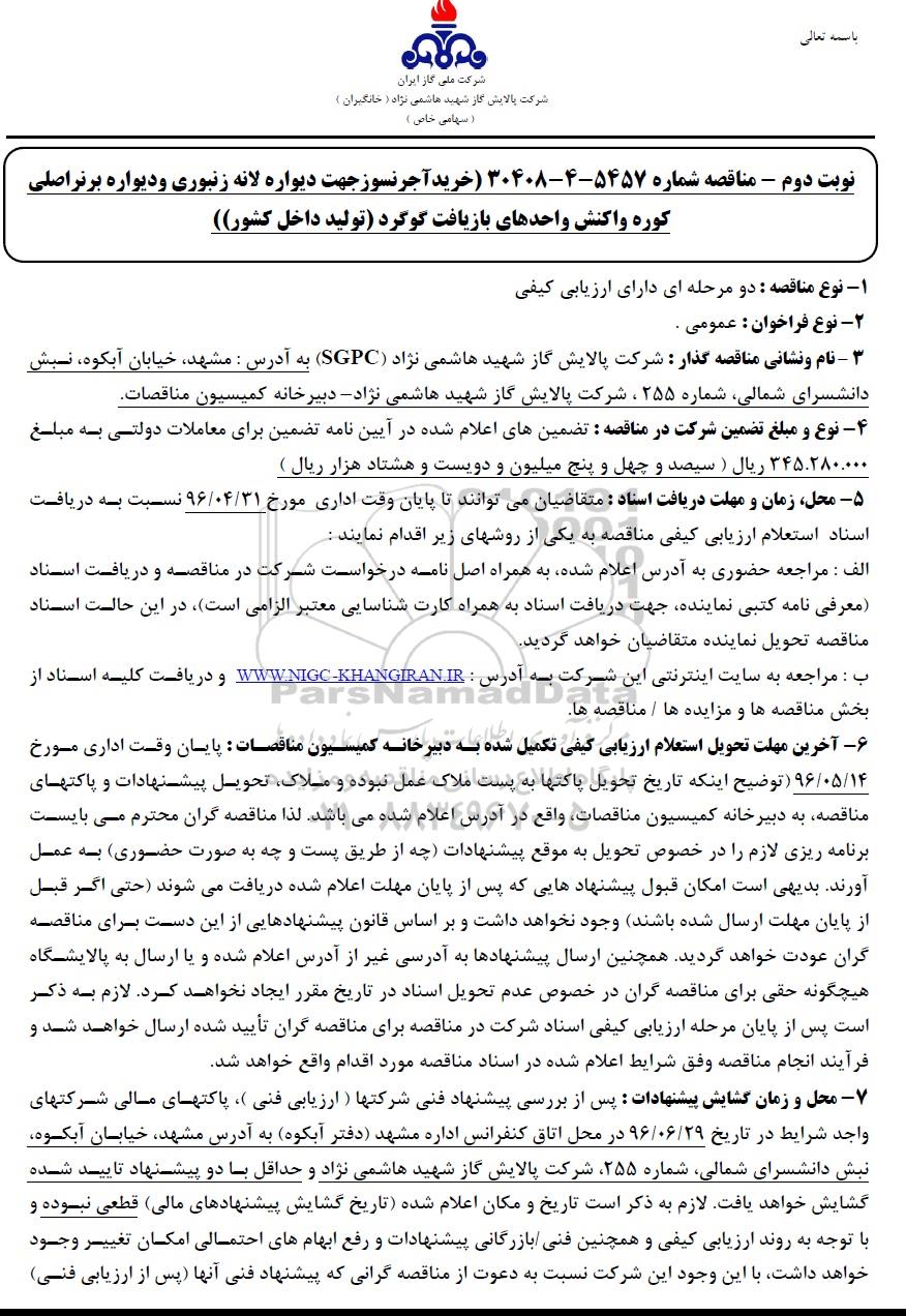 مراجعه به سایت اینترنتی این شرکت به آدرس WWW.NIGC-KHANGIRAN.IR و دریافت کلیه اسناد مناقصه از بخش مناقصه ها و مزایده ها/ مناقصه ها
