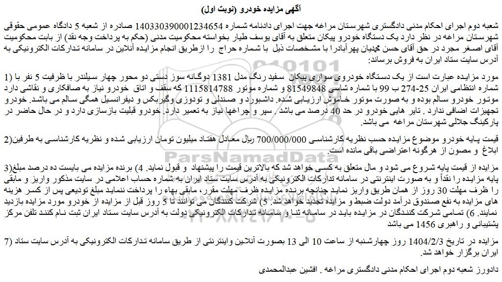 شعبه دوم اجرای احکام مدنی دادگستری شهرستان مراغه جهت اجرای دادنامه شماره 140330390001234654 صادره از شعبه 5 دادگاه عمومی حقوقی شهرستان مراغه در نظر دارد یک دستگاه خودرو پیکان متعلق به آقای یوسف طیار بخواسته محکومیت مدنی (حکم به پرداخت وجه نقد) از بابت محکومیت آقای اصغر مجرد در حق آقای حسن محمدیان پهرآبادرا با مشخصات ذیل  با شماره حراج  را ازطریق انجام مزایده آنلاین در سامانه تدارکات الکترونیکی به آدرس سایت ستاد ایران به فروش برساند:
