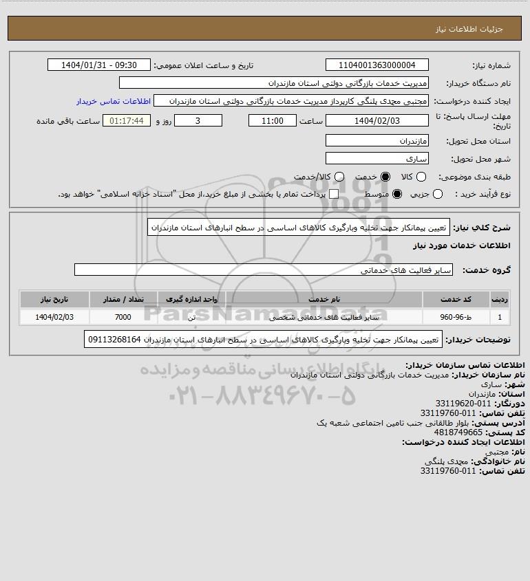 شرح کلی نیاز: تعیین پیمانکار جهت تخلیه وبارگیری کالاهای اساسی در سطح انبارهای استان مازندران