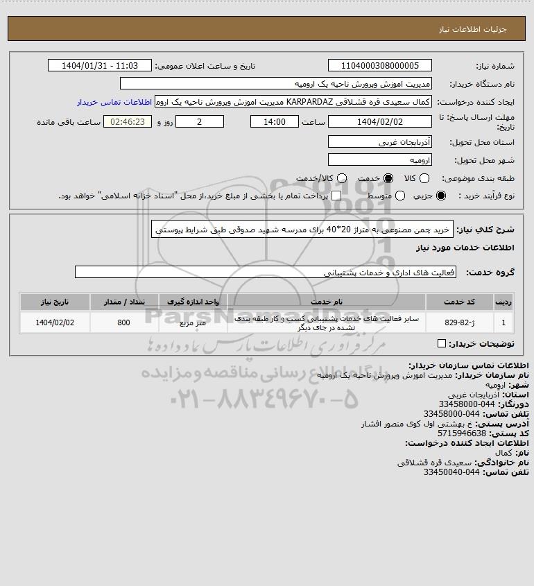 شرح کلی نیاز: خرید چمن مصنوعی به متراژ 20*40 برای مدرسه شهید صدوقی طبق شرایط پیوستی