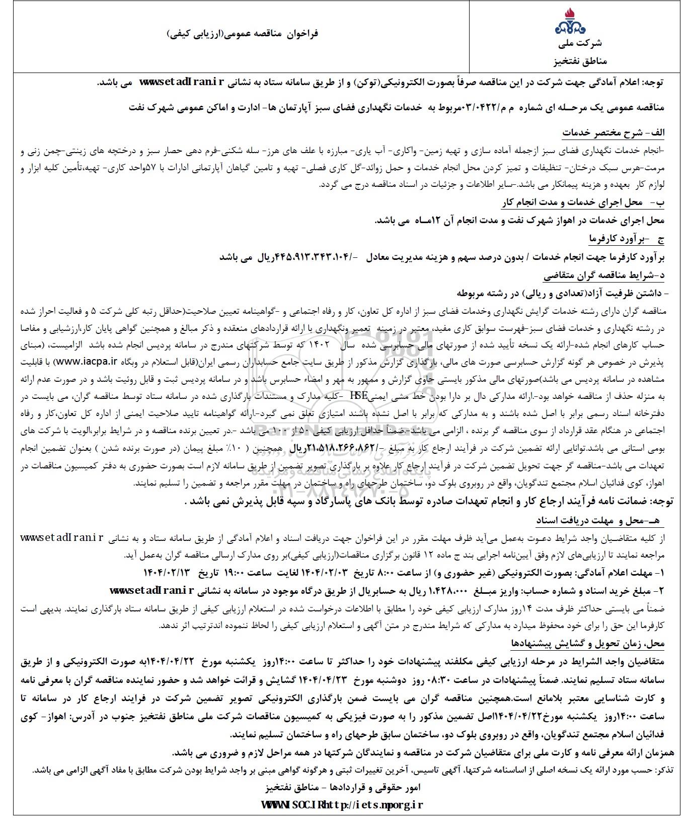 مناقصه عمومی یک مرحله ای شماره م م/ 03/0422 مربوط به خدمات نگهداری فضای سبز آپارتمانها - ادارت و اماکن عمومی شهرک نفت