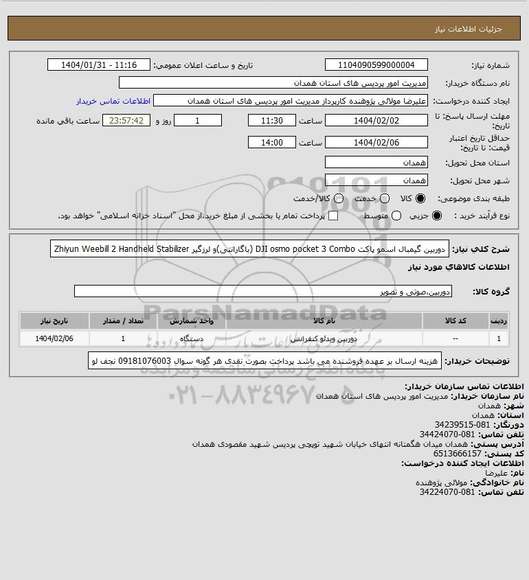 استعلام بها و موضوع استعلام استعلام دوربین گیمبال اسمو پاکت DJI osmo pocket 3 Combo (باگارانتی)و لرزگیر Zhiyun Weebill 2 Handheld Stabilizer به اطلاع کلیه شرکت‌ها و افراد متخصص واجد شرایط می‌رساند، آگهی گذار در نظر دارد از طریق استعلام بها، نسبت به انتخاب و دریافت پیشنهادات اقدام نماید. این استعلام با کد آگهی ثبت شده در سامانه خبرگزاری پارس نماد : 8900428 منتشر شده است. مشخصات استعلام : تاریخ شروع استعلام: 1404/01/31 آخرین مهلت ارسال پیشنهاد قیمت : 1404/02/02 و محل اجرای پروژه : استان همدان میباشد. استعلام قیمت مورد درخواست : استعلام دوربین گیمبال اسمو پاکت DJI osmo pocket 3 Combo (باگارانتی)و لرزگیر Zhiyun Weebill 2 Handheld Stabilizer با دسته‌بندی‌های تخصصی و گروه های مرتبط : صوت و تصویر - وسایل عکاسی و دیتا پرژکتور, سالن های آمفی تئاتر ، سینما و جلسات, استعلام اطلاع رسانی میگردد.