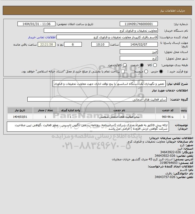 استعلام تعمیر و نگهداری یک دستگاه اسانسور با پنج توقف اداری جهت معاونت تحقیقات و فناوری, استعلام تعمیر و نگهداری یک دستگاه اسانسور با پنج توقف اداری جهت معاونت تحقیقات و فناوری