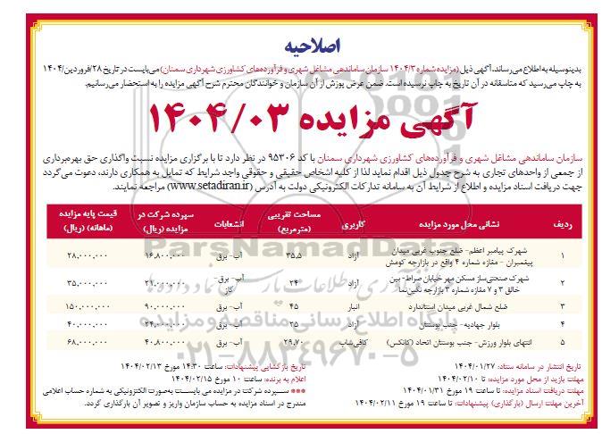 بدینوسیله به اطلاع می رساند آگهی ذیل (مزایده شماره 1404/03 سازمان ساماندهی مشاغل شهری و فرآورده های کشاورزی شهرداری سمنان) می بایست در تاریخ 28 فروردین 1404 به چاپ میرسید که متاسفانه در آن تاریخ به چاپ نرسیده است. ضمن عرض پوزش از آن سازمان و خوانندگان محترم شرح آگهی مزایده را به استحضار می رسانیم.