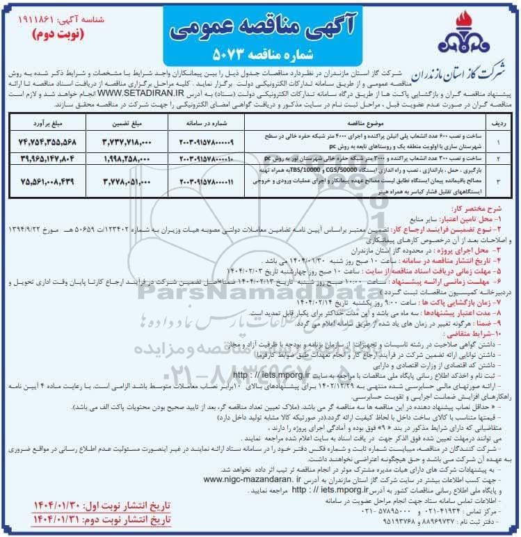 شرکت گاز استان مازندران در نظر دارد مناقصات جدول ذیل را بین پیمانکاران واجد شرایط با مشخصات و شرایط ذکر شده به روش مناقصه عمومی و از طریق سامانه تدارکات الکترونیکی دولت برگزار نماید. کلیه مراحل برگزاری مناقصه از دریافت اسناد مناقصه تا ارائه پیشنهاد مناقصه گران و بازگشایی پاکت ها از طریق درگاه سامانه تدارکات الکترونیکی دولت (ستاد) به آدرس ستاد ایران انجام خواهد شد و لازم است مناقصه گران در صورت عدم عضویت قبل، مراحل ثبت نام در سایت مذکور و دریافت گواهی امضای الکترونیکی را جهت شرکت در مناقصه محقق سازند.