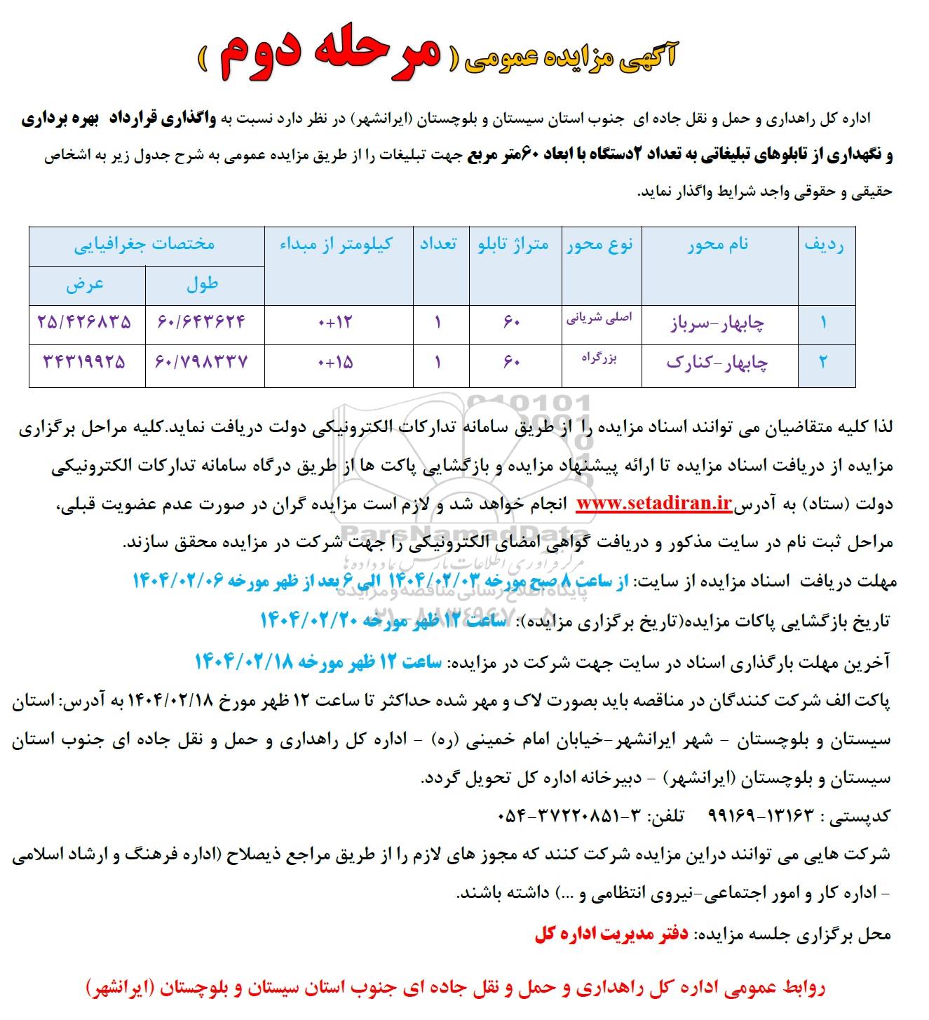 اداره کل راهداری و حمل و نقل جاده ای جنوب استان سیستان و بلوچستان (ایرانشهر) در نظر دارد نسبت به واگذاری قرارداد بهره برداری و نگهداری از تابلوهای تبلیغاتی به تعداد 2 دستگاه با ابعاد 60 مترمربع جهت تبلیغات را از طریق مزایده عمومی به شرح جدول زیر به اشخاص حقیقی و حقوقی واجد شرایط واگذار نماید.
