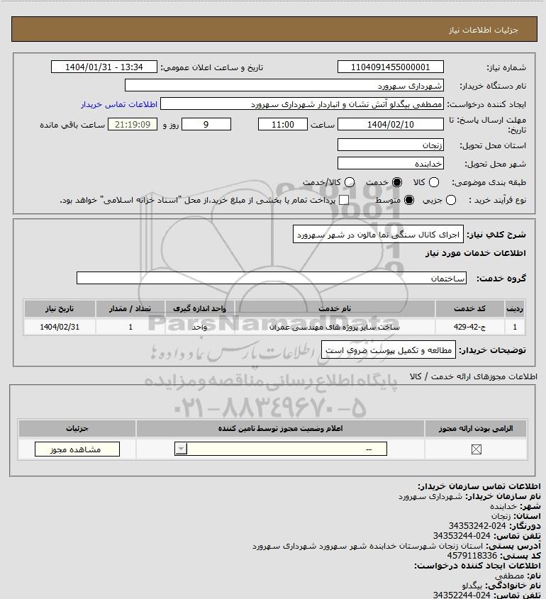شرح کلی نیاز: اجرای کانال سنگی نما مالون در شهر سهرورد