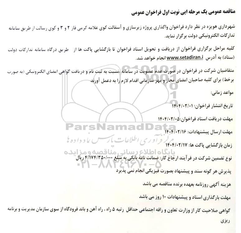 شهرداری هویزه در نظر دارد فراخوان واگذاری پروژه زیرسازی و آسفالت کوی علامه کرمی فاز 2 و 3 و کوی رسالت از طریق سامانه تدارکات الکترونیکی دولت برگزار نماید.