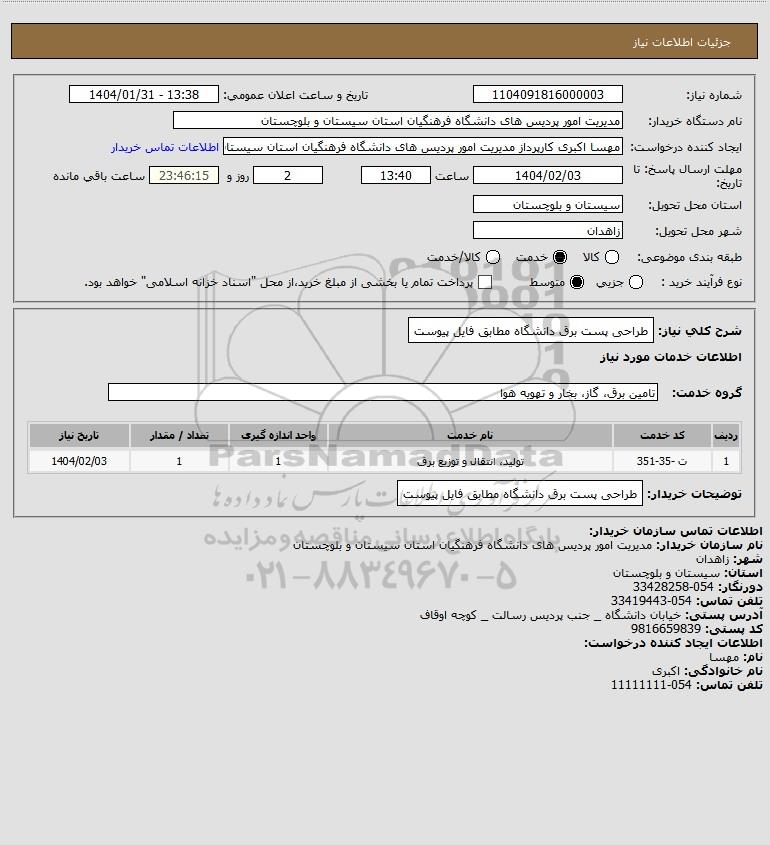 شرح کلی نیاز: طراحی پست برق دانشگاه مطابق فایل پیوست