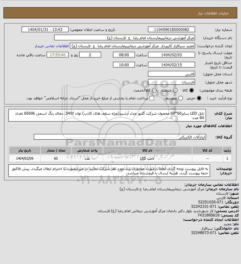 شرح کلی نیاز: تایل LED سایز60*60 محصول شرکت گلنور مدل آرشید(ویژه سقف های کاذب) توان 54W، دمای رنگ اسمی 6500k تعداد 60 عدد