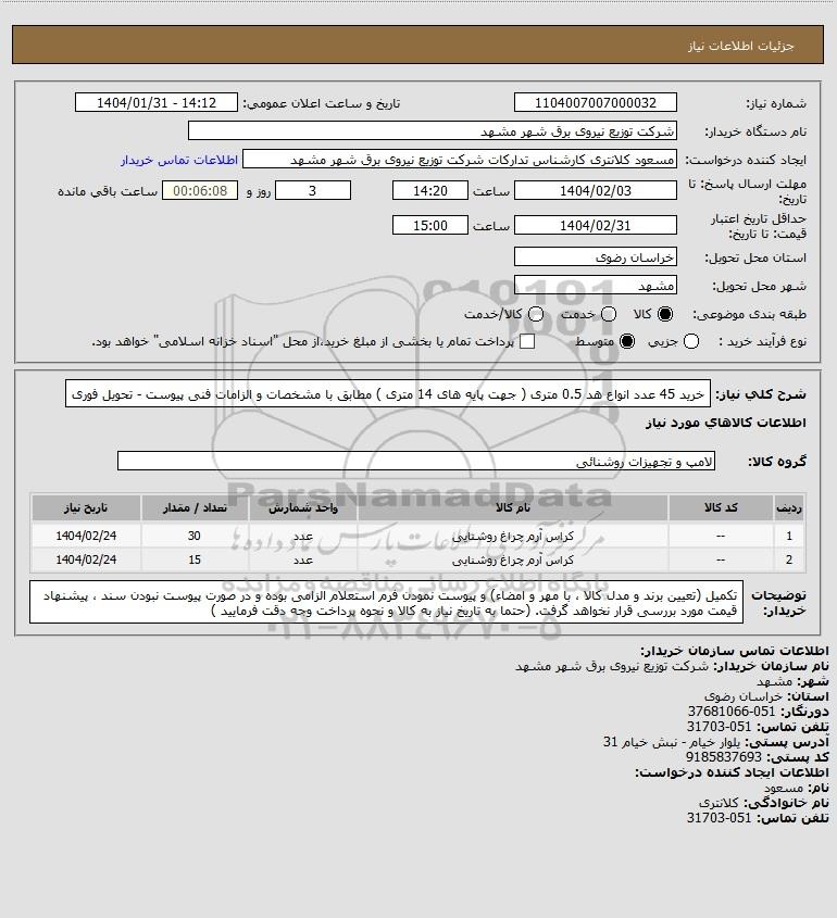 نام سازمان خریدار: شرکت توزیع نیروی برق شهر مشهد