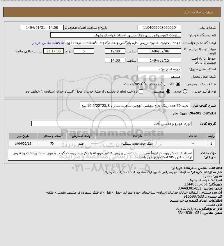 شرح کلی نیاز: خرید 70 عدد رینگ چرخ تیوبلس اتوبوس شهری