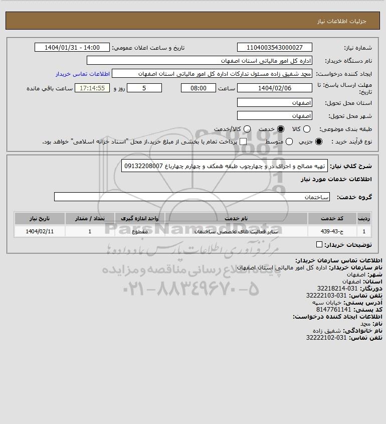 شرح کلی نیاز: تهیه مصالح و اجرای در و چهارچوب طبقه همکف و چهارم چهارباغ