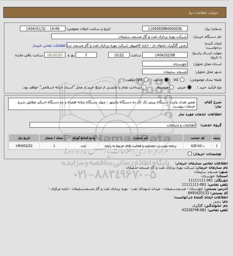 شرح کلی نیاز: تعمیر تعداد پانزده دستگاه پرینتر تک کار ده دستگاه مانیتور ؛ چهار دستگاه رایانه همراه و دو دستگاه اسکنر مطابق شرح خدمات پیوست