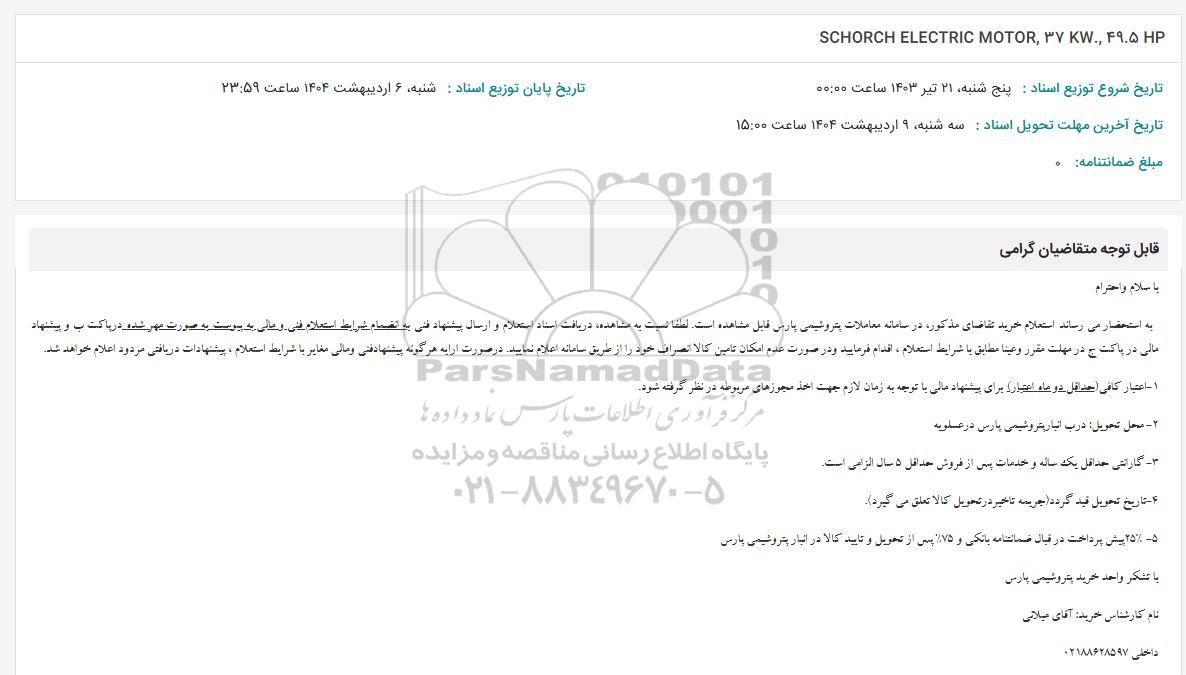 به استحضار می رساند استعلام خرید تقاضای مذکور در سامانه معاملات پتروشیمی پارس قابل مشاهده است. لطفا نسبت به مشاهده دریافت استاد استعلام و ارسال پیشنهاد فنی به انضمام شرایط استعلام في و عالی به پیوست به صورت مهر شده در پاکت به و پیشنهاد مالی در پاکت ج در مهلت مقرر وعينا مطابق با شرایط استعلام ، اقدام فرمایید و در صورت عدم امکان تامین کالا انصراف خود را از طریق سامانه اعلام نمایید. در صورت ارائه هر گونه پیشنها دفنی و مالی مغایر با شرایط استعلام ، پیشنهادات دریافتی مردود اعلام خواهد شد.