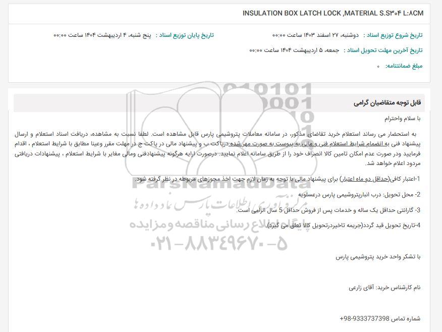 با سلام و احترام به استحضار میرساند استعلام خرید تقاضای مذکور در سامانه معاملات پتروشیمی پارس قابل مشاهده است. لطفا نسبت به مشاهده دریافت اسناد استعلام و ارسال پیشنهاد فنی به انضمام شرایط استعلام فنی و مالی به پیوست به صورت مهر شده در پاکت ب و پیشنهاد مالی در پاکت ج در مهلت مقرر وعينا مطابق با شرایط استعلام ، اقدام فرمایید و در صورت عدم امکان تامین کالا انصراف خود را از طریق سامانه اعلام نمایید. در صورت ارایه هرگونه پیشنها دفنی و مالی مغایر با شرایط استعلام پیشنهادات دریافتی مردود اعلام خواهد شد.