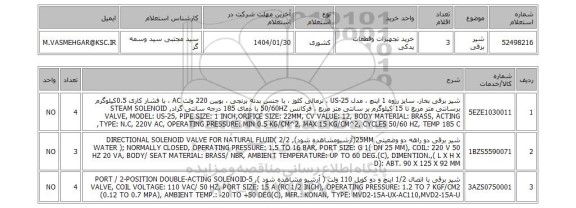 | 52498216 | شیر برقی | 3 | خرید تجهیزات وقطعات یدکی | کشوری | 1404/01/30 | سید مجتبی سید وسمه گر | M.VASMEHGAR@KSC.IR |