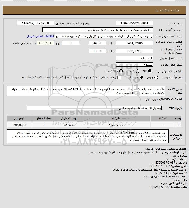 نام دستگاه خریدار:سازمان مدیریت حمل و نقل بار و مسافر شهرداری سنندج