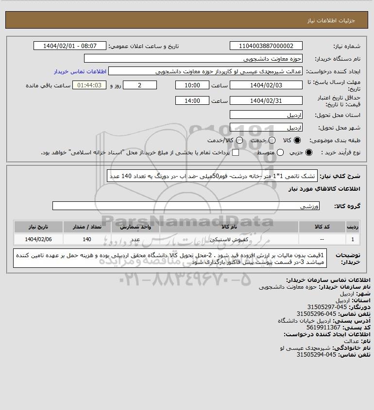 استعلام بها و موضوع استعلام استعلام تشک تاتمی 1*1 متر -خانه درشت- فوم50میلی -ضد اب -در دورنگ یه تعداد 140 عدد به اطلاع کلیه شرکتها و افراد متخصص واجد شرایط میرساند، آگهی گذار در نظر دارد از طریق استعلام بها، نسبت به انتخاب و دریافت پیشنهادات اقدام نماید. این استعلام با کد آگهی ثبت شده در سامانه خبرگزاری پارس نماد : 8903542 منتشر شده است. مشخصات استعلام : تاریخ شروع استعلام: 1404/02/01 آخرین مهلت ارسال پیشنهاد قیمت : 1404/02/03 و محل اجرای پروژه : استان اردبیل میباشد. استعلام قیمت مورد درخواست : استعلام تشک تاتمی 1*1 متر -خانه درشت- فوم50میلی -ضد اب -در دورنگ یه تعداد 140 عدد با دستهبندیهای تخصصی و گروه های مرتبط : البسه و پوشاک, انواع کفپوش, قطعات لاستیکی, تجهیزات ورزشی, استعلام اطلاع رسانی میگردد.
