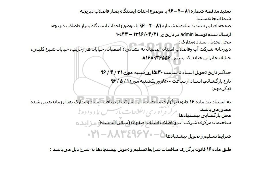 تمدید مناقصه شماره 81 -2 -96 با موضوع احداث ایستگاه پمپاژ فاضلاب دیزیچه