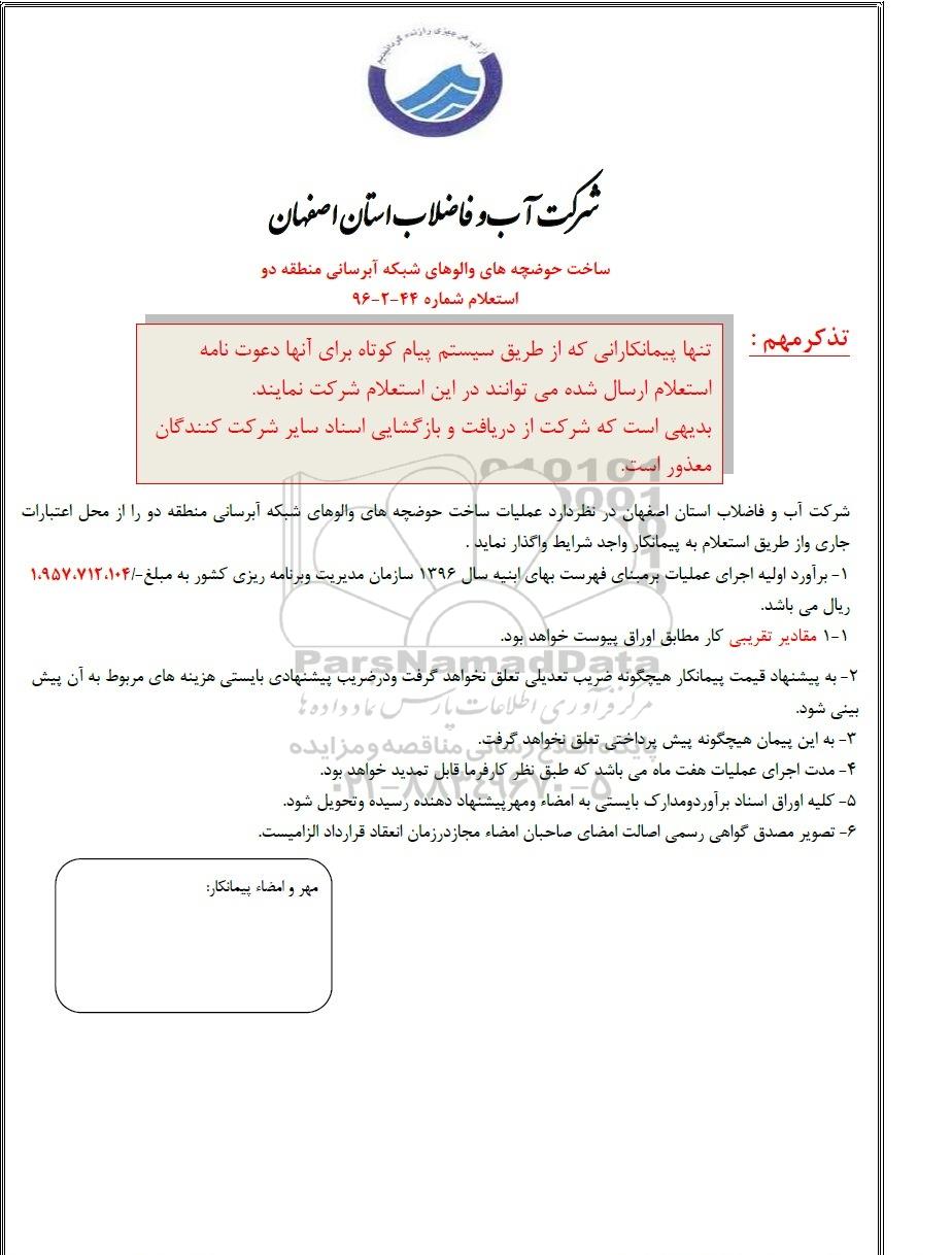 شرکت آب وفاضلاب استان اصفهان در نظر دارد عملیات ساخت حوضچه های والوهای شبکه آبرسانی منطقه دو را از محل اعتباران جاری و از طریق استعلام به پیمانکار واجد شرایط واگذار نماید