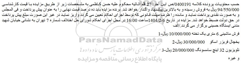 حسب محتویات پرونده کلاسه 0400191/ص این اجرا 27 قلم اثاثیه محکوم علیه حسن کاظمی به مشخصات زیر از طریق مزایده با قیمت کارشناسی 94/550/000 ریال به فروش رسیده و به بالاترین پیشنهاد واگذار خواهد شد. برنده مزایده باید ده درصد قیمت نهایی را به عنوان پیش پرداخت و فی المجلس و به صورت نقدی پرداخت نماید و مانده را ظرف مهلت قانونی که توسط اجرای احکام تعیین می گردد واریز نماید در غیر این صورت مبلغ پیش پرداخت در حق دولت ضبط خواهد شد. مزایده در تاریخ 1404/2/6ساعت 16:00 در محل اجرای احکام شورای حل اختلاف شماره 7 تهران به نشانی خیابان شهید مدنی ایستگاه حسینی برگزار می گردد./الف