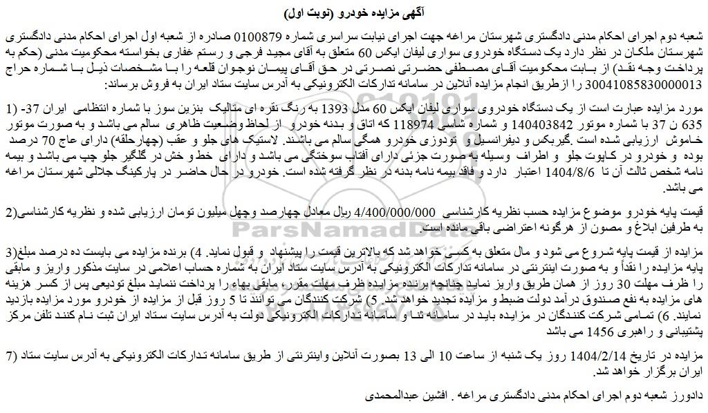 شعبه دوم اجرای احکام مدنی دادگستری شهرستان مراغه جهت اجرای نیابت سراسری شماره 0100879 صادره از شعبه اول اجرای احکام مدنی دادگستری شهرستان ملکان در نظر دارد یک دستگاه خودروی سواری لیفان ایکس 60 متعلق به آقای مجید فرجی و رستم غفاری بخواسته محکومیت مدنی (حکم به پرداخت وجه نقد) از بابت محکومیت آقای مصطفی حضرتی نصرتی در حق آقای پیمان نوجوان قلعه را با مشخصات ذیل با شماره حراج 30041085830000013 را ازطریق انجام مزایده آنلاین در سامانه تدارکات الکترونیکی به آدرس سایت ستاد ایران به فروش برساند: