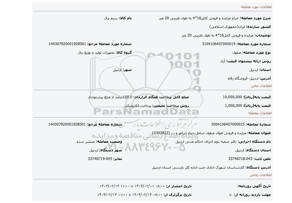 شرح مورد معامله: حراج مزایده و فروش کابل16*4 به طول تقریبی 20 متر | نام کالا: سیم برق | |
