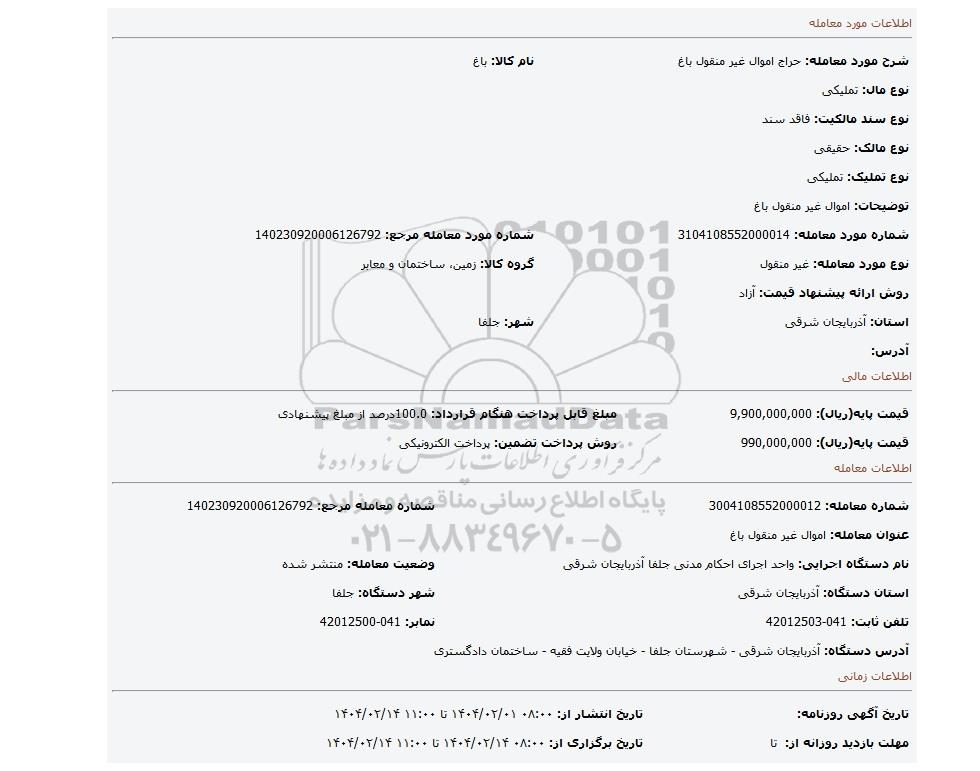 مزایده عمومی مزایده اموال غیر منقول باغ برگزار میگردد. از کلیه افراد متخصص و شرکت‌های واجد شرایط دعوت به عمل می‌آید تا در این مزایده با کد خبرگزاری پارس نماد : 8904412 شرکت نمایند تاریخ شروع مزایده : 1404/02/01 مهلت شرکت در مزایده: تا پایان روز 1404/02/14 مکان برگزاری اموال واگذاری استان‌های آذربایجان شرقی و دسته‌بندی‌های مربوط به این حراجی ماشین آلات و تجهیزات کشاورزی و دام پروری, سرمایه گذاری میباشد.