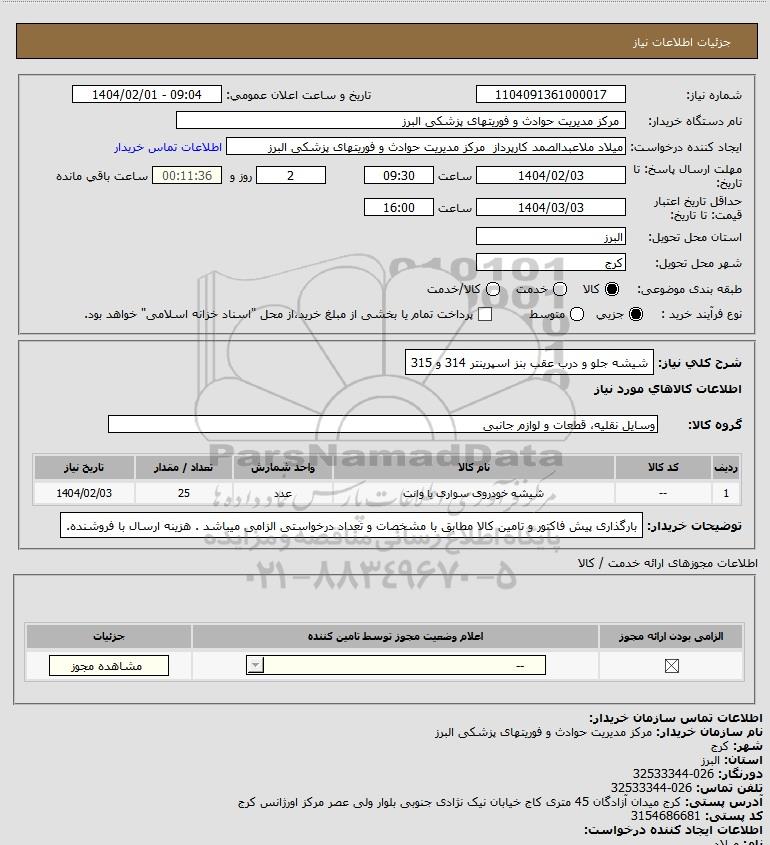 شرح کلی نیاز: شیشه جلو و درب عقب بنز اسپرینتر 314 و 315