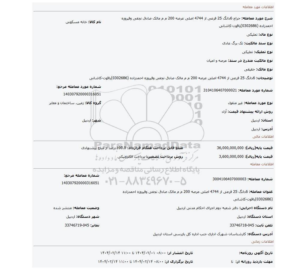 شرح مورد معامله: حراج 6دانگ 25 فرعی از 4744 اصلی عرصه 200 م م مالک صادق نجفی وفیروزه احمدزاده (0302686)یاقوت-کاشانی | نام کالا: خانه مسکونی | |