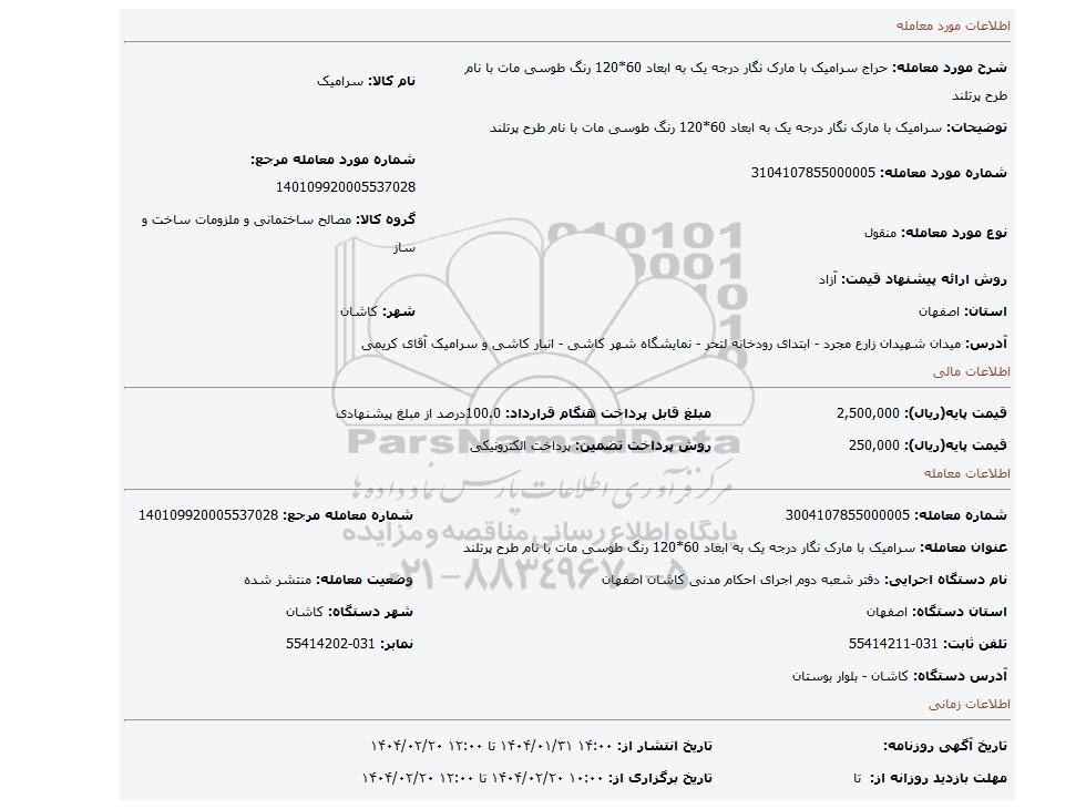 | شماره معامله: 3004107855000005 | شماره معامله مرجع: 140109920005537028 | |