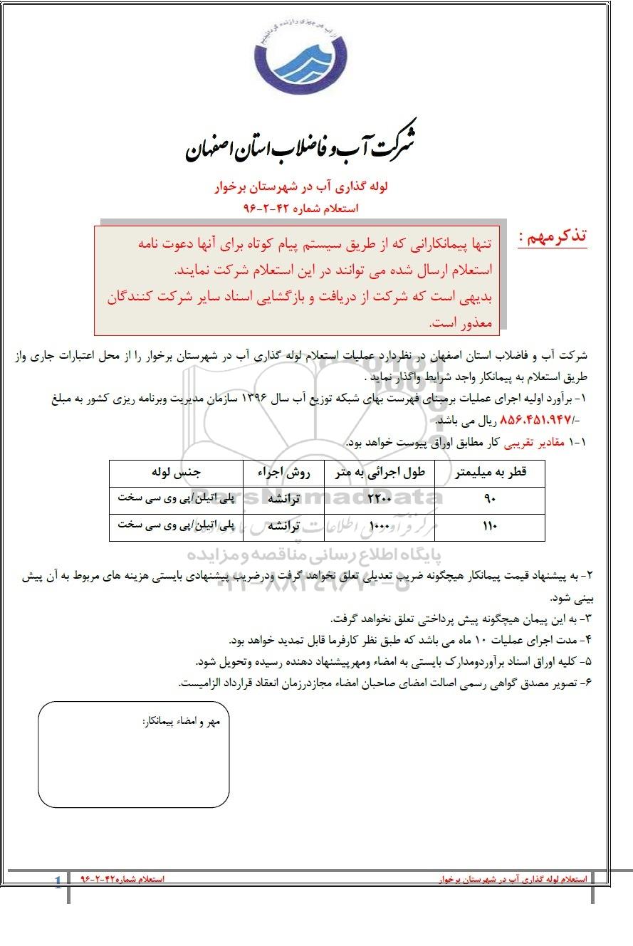 شرکت آب و فاضلاب استان اصفهان در نظر دارد عملیات استعلام لوله گذاری آب در شهرستان برخوار را از محل اعتبارات جاری و از طریق استعلام به پیمانکاران واجد شرایط واگذار نماید.