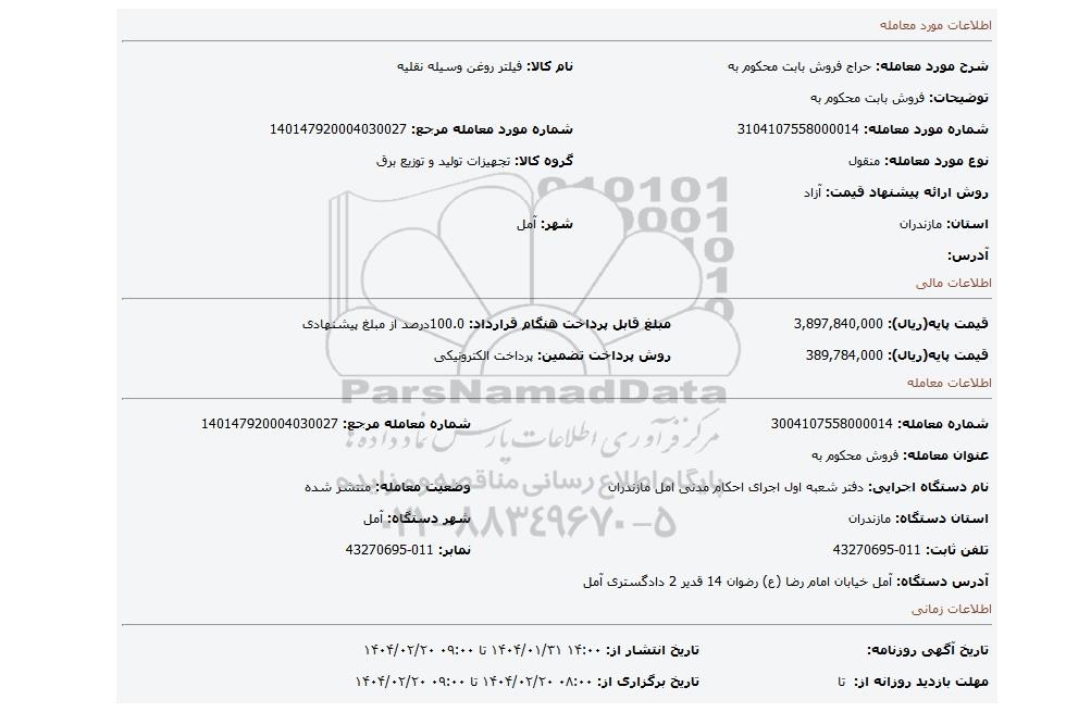 | نام دستگاه اجرایی: دفتر شعبه اول اجرای احکام مدنی امل مازندران | وضعیت معامله: منتشر شده | |