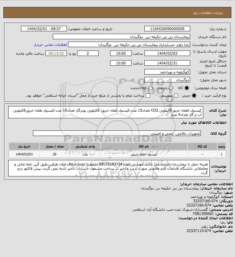 شرح کلی نیاز: کپسول اطفاء حریق6کیلویی CO2 تعداد15 عدد-کپسول طفاء حریق 6کیلویی پودرگاز تعداد10 عدد-کپسول طفاء حریق6کیلویی آب و گاز تعداد4 عدد