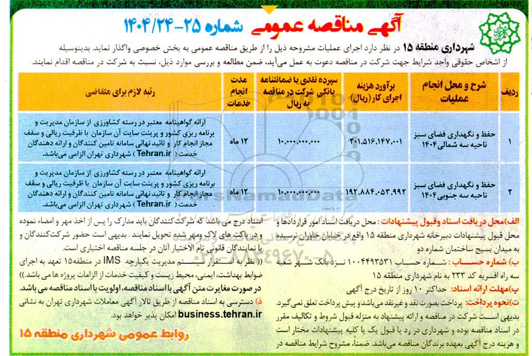 | 1 | حفظ و نگهداری فضای سبز ناحیه سه شمالی 1404 | 201.516.147.001 | 10.000.000.000 | 12 ماه | ارائه گواهینامه معتبر در رسته کشاورزی از سازمان مدیریت و برنامه ریزی کشور سایت آن با ظرفیت ریالی و سقف مجاز انجام کار و تایید نهایی سامانه تامین کنندگان و ارائه دهندگان خدمت tehran.ir شهرداری تهران الزامی میباشد |