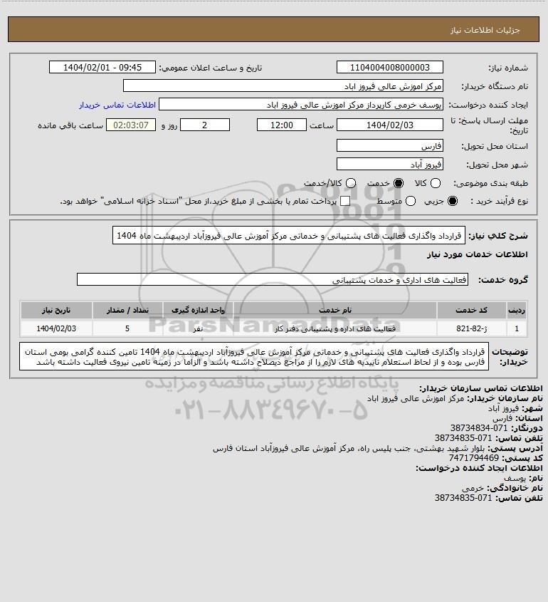 شرح کلی نیاز: قرارداد واگذاری فعالیت های پشتیبانی و خدماتی مرکز آموزش عالی فیروزآباد اردیبهشت ماه 1404