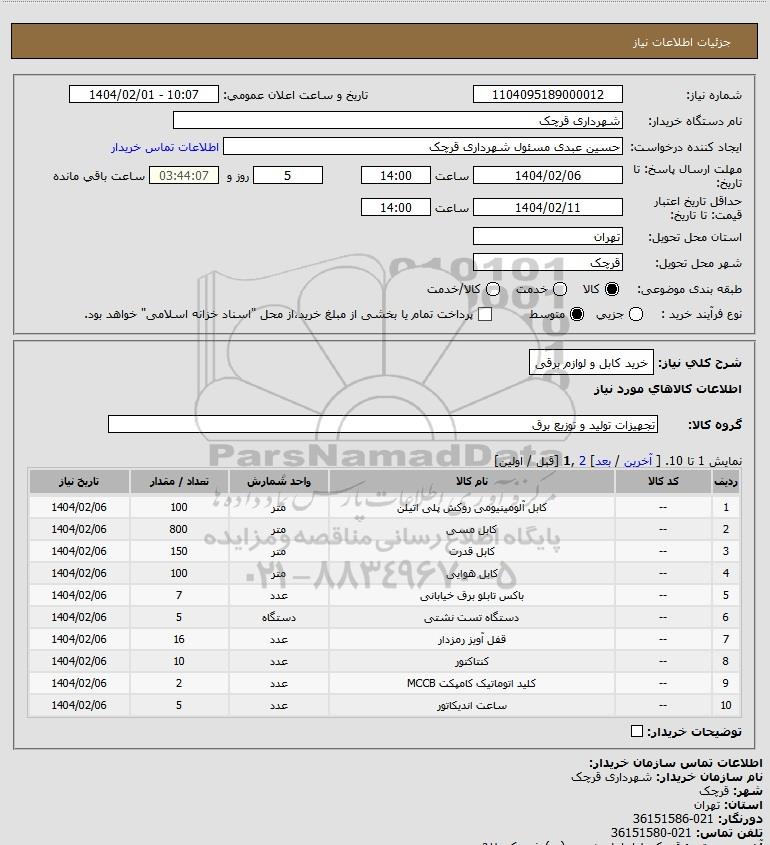 | 4 | -- | کابل هوایی | متر | 100 | 1404/02/06 |