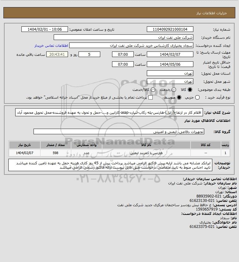 شرح کلی نیاز: اقلام کار در ارتفاع(راپل)-هارنس-پله رکاب-لنیارد-asap-کارابین و....-حمل و تحول به عهده فروشنده-محل تحویل محمود آباد
