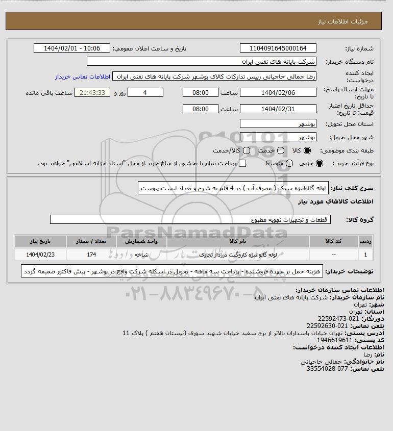 شرح کلی نیاز: لوله گالوانیزه سبک ( مصرف آب ) در 4 قلم به شرح و تعداد لیست پیوست