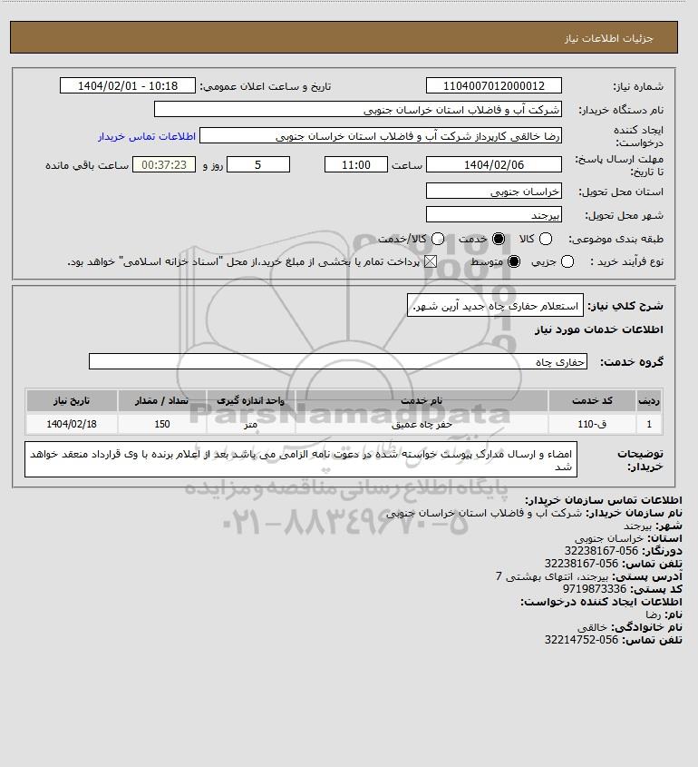 شرح کلی نیاز: استعلام حفاری چاه جدید آرین شهر.